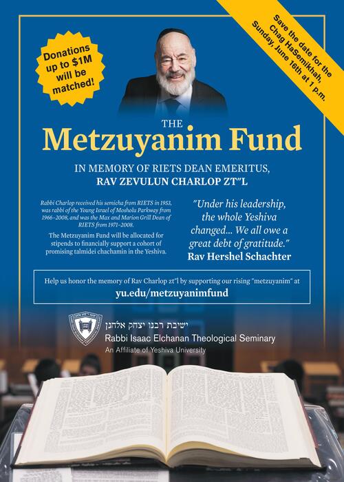 Our Dean Emeritus, Rabbi Zevulun Charlop Zt"l, was a pillar of the RIETS community for decades and aided countless talmidim (or, as he would say, "metzuyanim") on their path to becoming rabbanim. As we prepare to celebrate the Chag HaSemikhah, we are privileged to establish the Metzuyanim Fund in his memory to financially support a yearly cohort of promising talmidei chachamim learning in our kollel. Thanks to a generous donor, contributions will be matched up to $1 million! Please consider supporting our rising metzuyanim in order to continue the tradition of excellence and success in learning that Rabbi Charlop embodied. Donations can be made at https://ru.31irv.shop/MetzuyanimFund